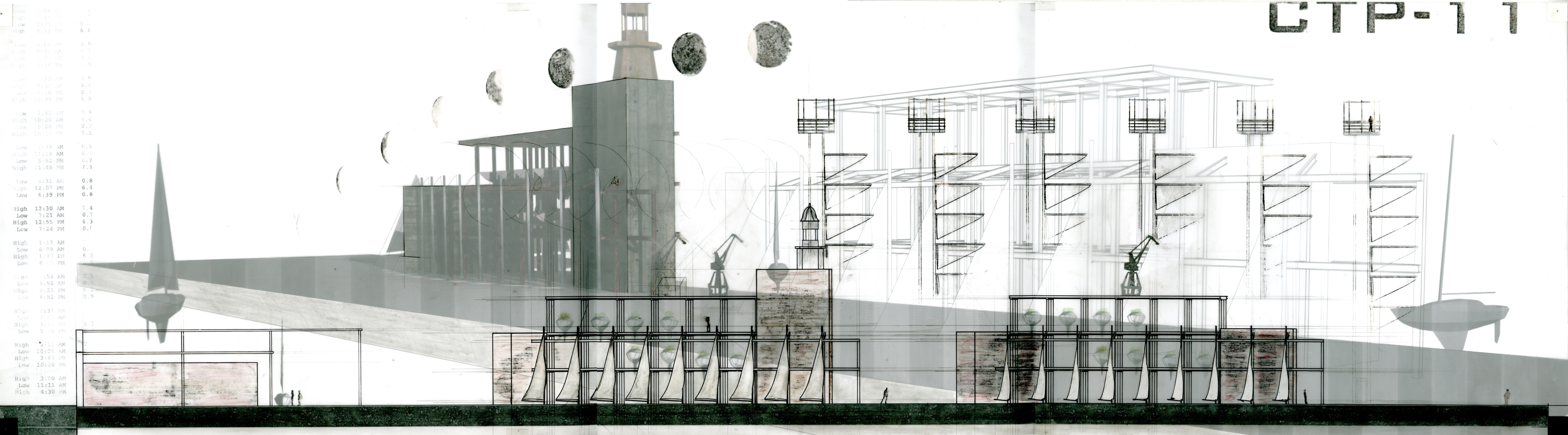 "site: Race Street Pier/Spring 2011/Professor S. Patel From Prfessor Sneha Patel's ""the Weather Archive Sudio"". Weather Phenomenon : Clouds The project is Cretum Tersus Pier 11 - loosely translated as "" To grow clean"". The idea behind the design is to use the pier as a nursery that would grow an aquatic plant that has a natural ability to remove pollutants from and cleanse the river. The plants, ( i believe i chose the water hyacinth, which is an invasive species) needed to be contained and controlled. So by using abandoned boat hulls as planters with a permeable bottom, the plants could cleanse the water once the hulls were deployed. To control the spread of the hyacinth the boats can elevate themsleves out of the water using a lever jacking system which tracks time by the incoming and outgoing tides as the metronome and after a two month cycle or 2 lunar cycles the boats and plants would be burned. The timeline of growing and cleaning coincides with the lunar timeline in which the process of launching new boats and burning of the old ones would become an event in itself attracting people to the pier to view the spectacle. "Critiques: